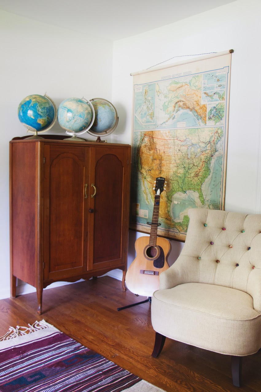 This space doesn’t have a specific style or theme; I didn’t plan it. It’s a conglomeration of old and new, vivid and neutral, light and dark, modern and traditional. But every object in this space has a little part of our story in it. Our living area contains everything from treasures found at yard sales (the vintage map, the creepily awesome monkey table, the Turkish pillows, and probably 75% of everything else), childhood possessions (one of the globes, the xylophone, the guitar), special gifts (the mandolin, the framed poster from my undergrad senior recital, many of the books), family pieces (the starburst clock, given to me by my grandfather and lovingly carted 1000 miles by my brother; the retro chair, salvaged from a dank basement; the armoire and dresser, which belonged to my great-grandfather; the painting over the mantel), to carefully scoped out and saved-for purchases (the tufted chair, the foyer mirror, the cowhide).