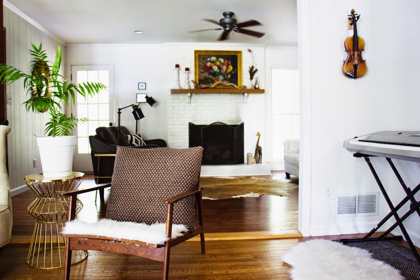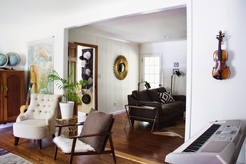 Our house is a 1970s ranch that came complete with formal living room and den. When we moved in, it was spacious and cozy, but it just didn’t have a great flow. Upon entering through the front door, you were greeted by a small doorway into the den, along with a very large, blank wall that divided the formal living room from the den. It wasn’t quite clear how to make your way into the main area of the house. And the large dividing wall between the two main rooms blocked much of the light on both sides of the house. Finally, we solved the problem by cutting a huge hole in the wall to create one continuous space for gathering, jamming, sprawling, and general hanging-out…ing. Now it’s a living room, library, music room, and teaching studio, all in one.