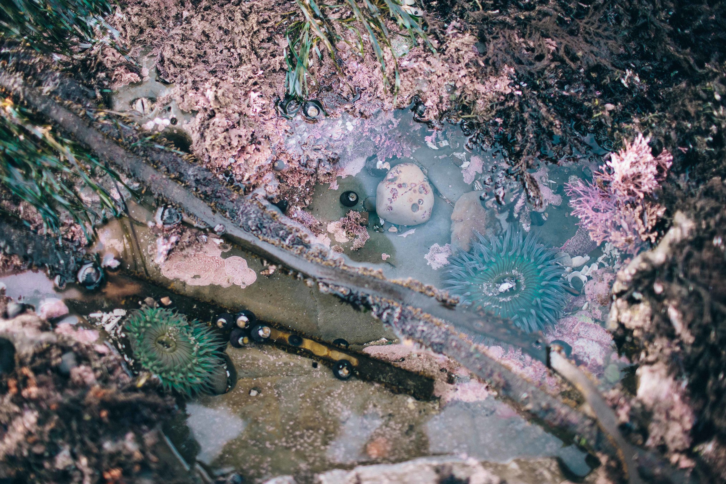 I think that no matter where you live, you can find surprises at every turn, if you’re the sort of person who keeps their eyes open. But I think it is especially true on the California coast. Out here, if you venture just a tiny bit outside of your usual zone (which, for us, is a relatively normal little neighborhood in the heart of the Silicon Valley tech world), it’s wild. It’s wilderness. And it’s full of colorful and bizarre surprises. A few weeks ago Jordan and I handed Sam over to a babysitter, as we do occasionally, and wandered over to Half Moon Bay to catch the sunset. When we got to the beach I had in mind to explore, we noticed something odd: instead of the usual sights of daytime beachgoers hiking back to their cars at dusk with armloads of beach chairs and surfboards, everyone was wearing galoshes and lugging five-gallon buckets. I stopped someone and asked what was going on (I’ve been here a year and a half now, but I find that I’m still asking that question constantly), and she said, “Tide is extra low tonight! Everyone’s harvesting mussels!” So we made our way out on the exposed reef, and we explored tide pool after tide pool, navigating around mollusks, urchins, anemones, limpets, and the long arms of kelp that stretched across the rocks, and we even found a starfish (pictured below), who got snatched up by about fifteen seagulls at once and carried out to sea in a huge ruckus. (Luckily for him, the gulls fought so hard over him that he got dropped straight back into the water, five arms flailing. Poor dude. He was really beautiful, too; I hope he made it home.)
