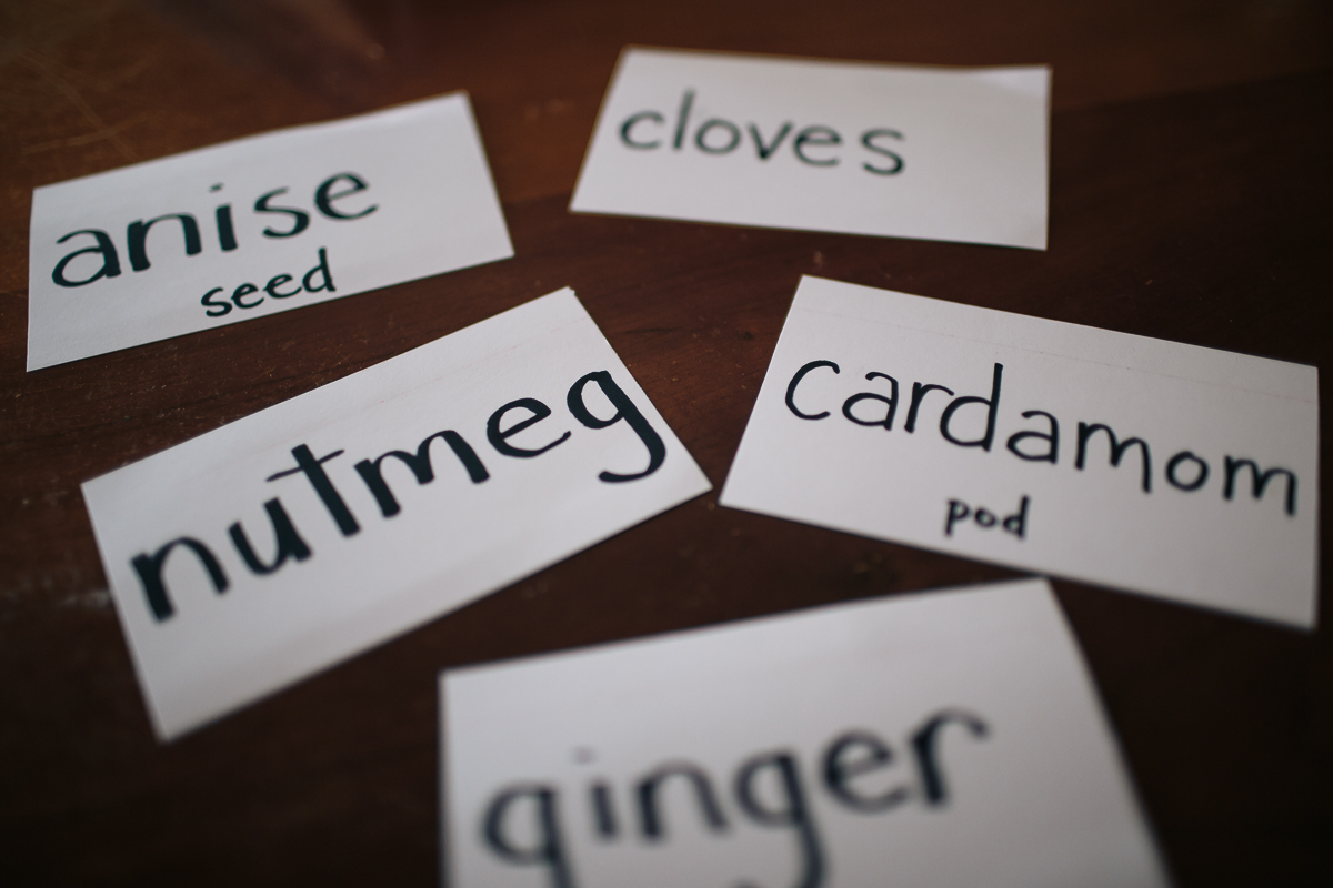 The next day, Day 2: I announced that it was Spice Tasting time, and we tackled some savory spices this time: basil, parsley, thyme, rosemary, dill, oregano. For the first time, Sam rejected some. He tried the rosemary and instantly made a face and said, “Noo.” Same with the dill. (I just said, “Okay, cool! No rosemary or dill. We’ll try again some other time!”) But he adored the oregano. Then we reviewed the index card words from the day before, which he was totally into. (I mean, “nutmeg” is a pretty great word.)