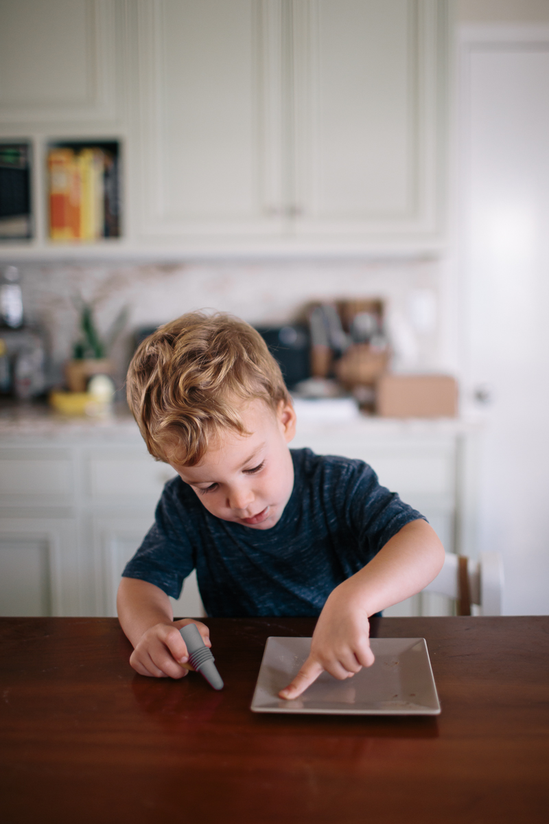 Now, before you get all impressed and begin to perceive that I’m raising a perfect eater: I’m not. Sam is not picky, which I’m grateful for, but we have our own challenges. The eating process is very, very slow around here. We’re working on independent eating and breaking bad habits of feeding him; he hates to get messy and he is not a fast eater. So mealtimes can be extremely slow and frustrating. But activities like this accomplish a few things: 1) they help to diffuse the stress that often builds around our meals; 2) they kindle a love for food and diverse tastes and smells (for Sam for the first time, and for me to renew my interest in food and creative cooking); 3) they orient Sam’s palate and mind to the world of food that’s available to him, as he makes connections between how our senses perceive objects through their written and spoken names, smells, textures, shapes, and tastes. And, in more ways than one, they make our eternal mealtimes a lot more palatable.