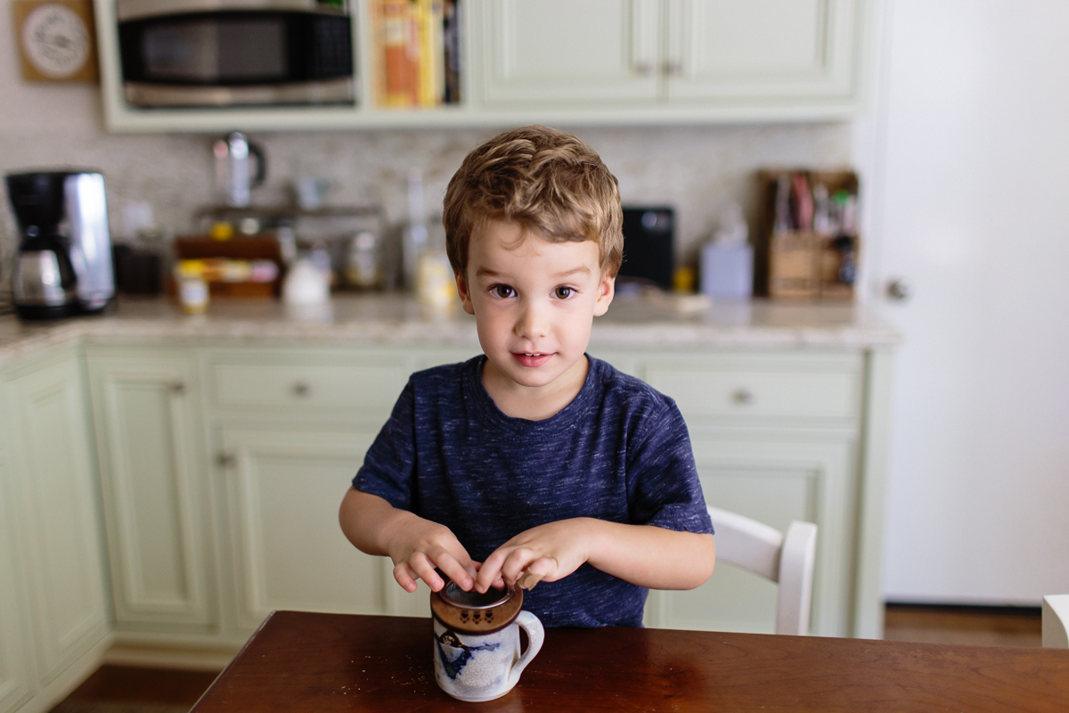 At any rate, at tea time, Sam gets out his tiny mug (handmade for him by his uncle, who is a ceramic artist), we boil some water in a kettle, and he picks out a type of tea from my embarrassingly large selection. I pour the water, we wait for the tea to steep, and then cool it down by pouring it back and forth between two mugs. Sam sometimes adds a tiny lump of sugar or a drizzle of honey (optional!) and stirs it up, and he sips it while I make dinner.