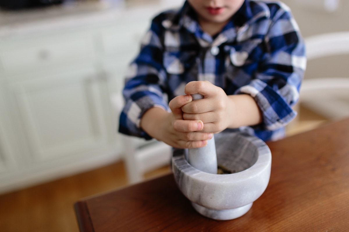 Day 1 we drank lemon tea; Day 2 we tried green tea; and on Day 3, we made chai. Sam, who loves spices, was totally into this. He counted out each whole spice, and then ground them up with a mortar and pestle, just for fun. Here’s our basic recipe, which we’ve adapted from various Indian friends.